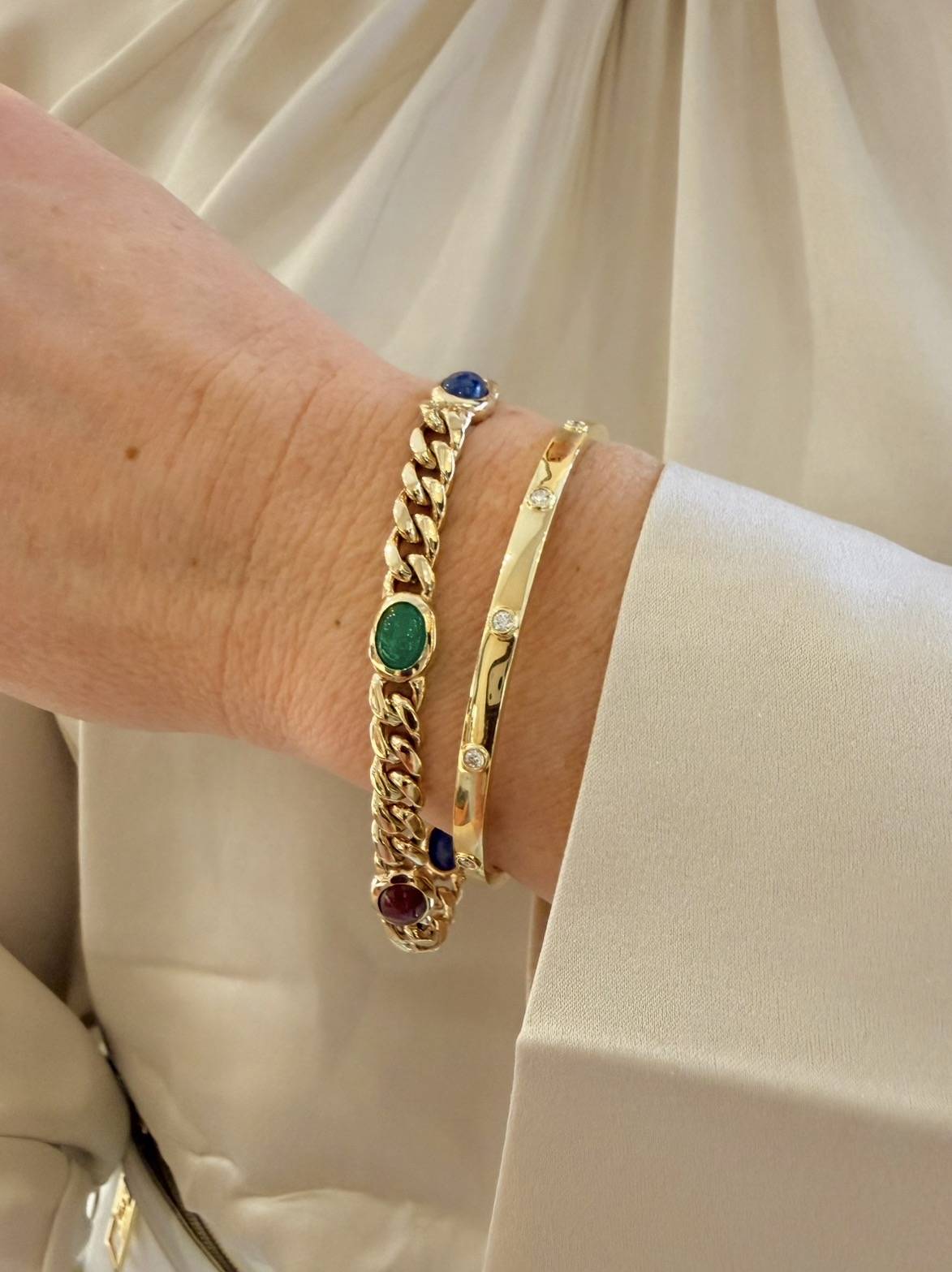 Afgewisseld met cabochon geslepen Robijn, saffier en smaragd,