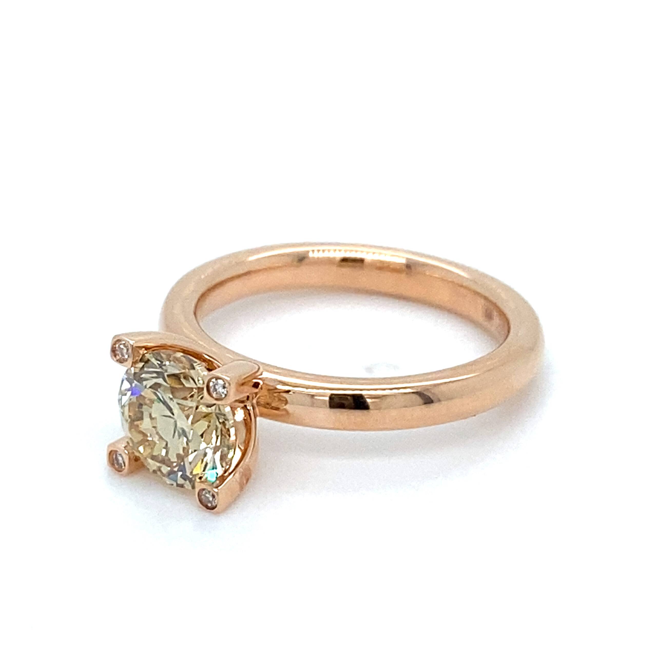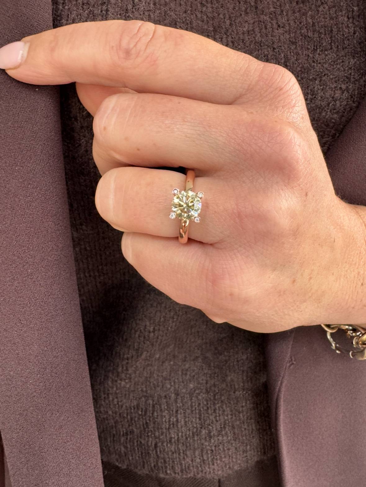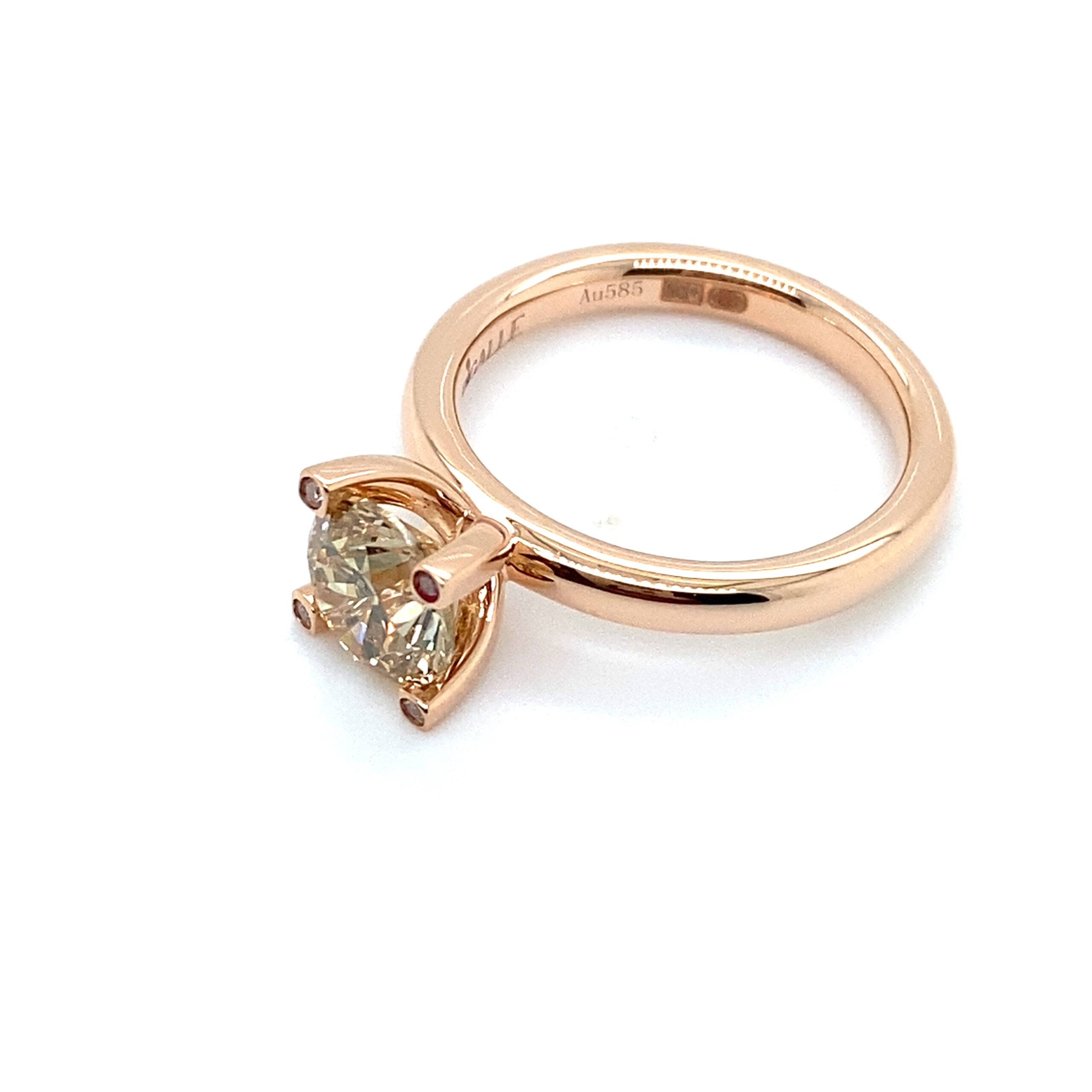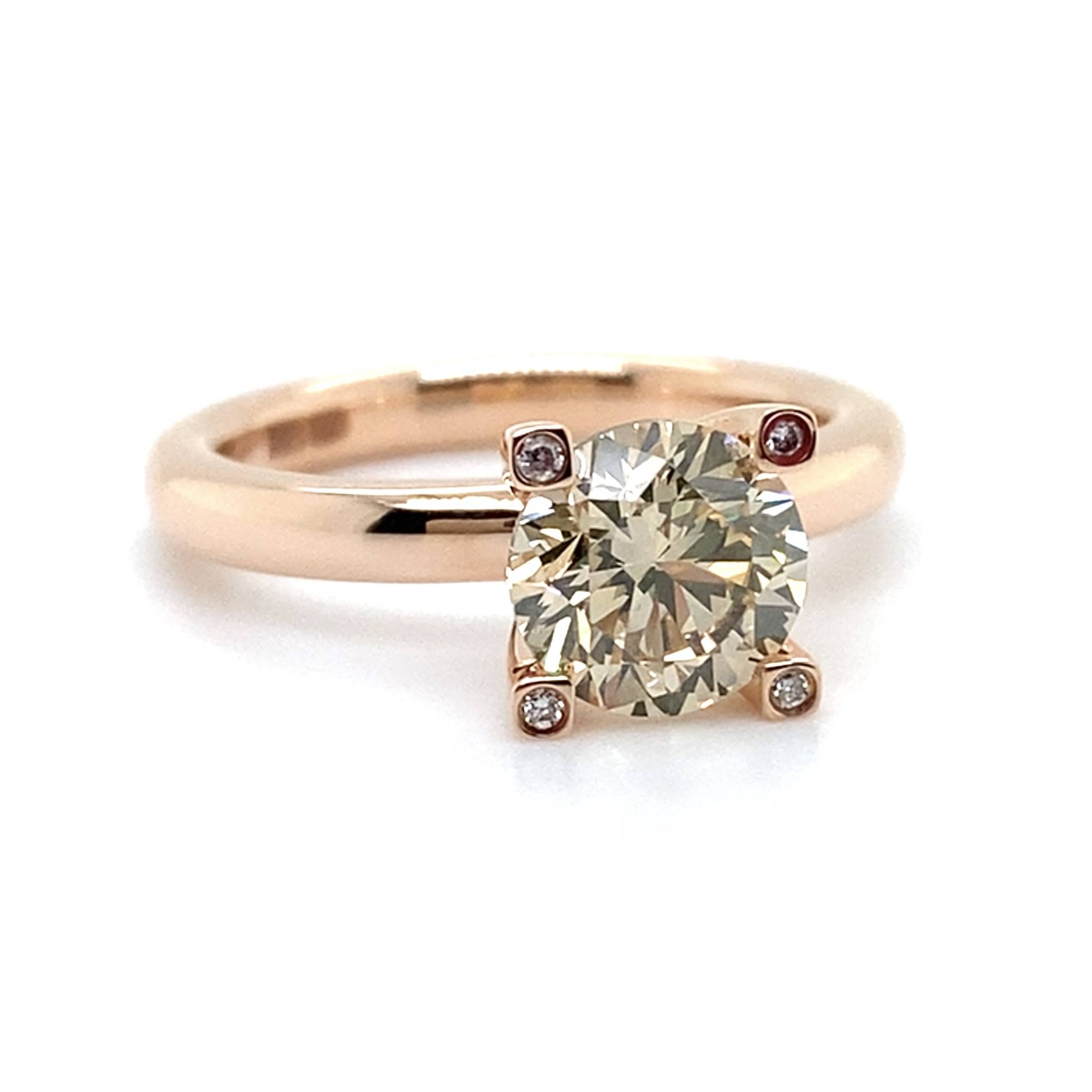 Deze grote champagne gekleurde diamant van 1.87crt is gezet in een robuuste roségouden ring waardoor de kleuren perfect matchen.