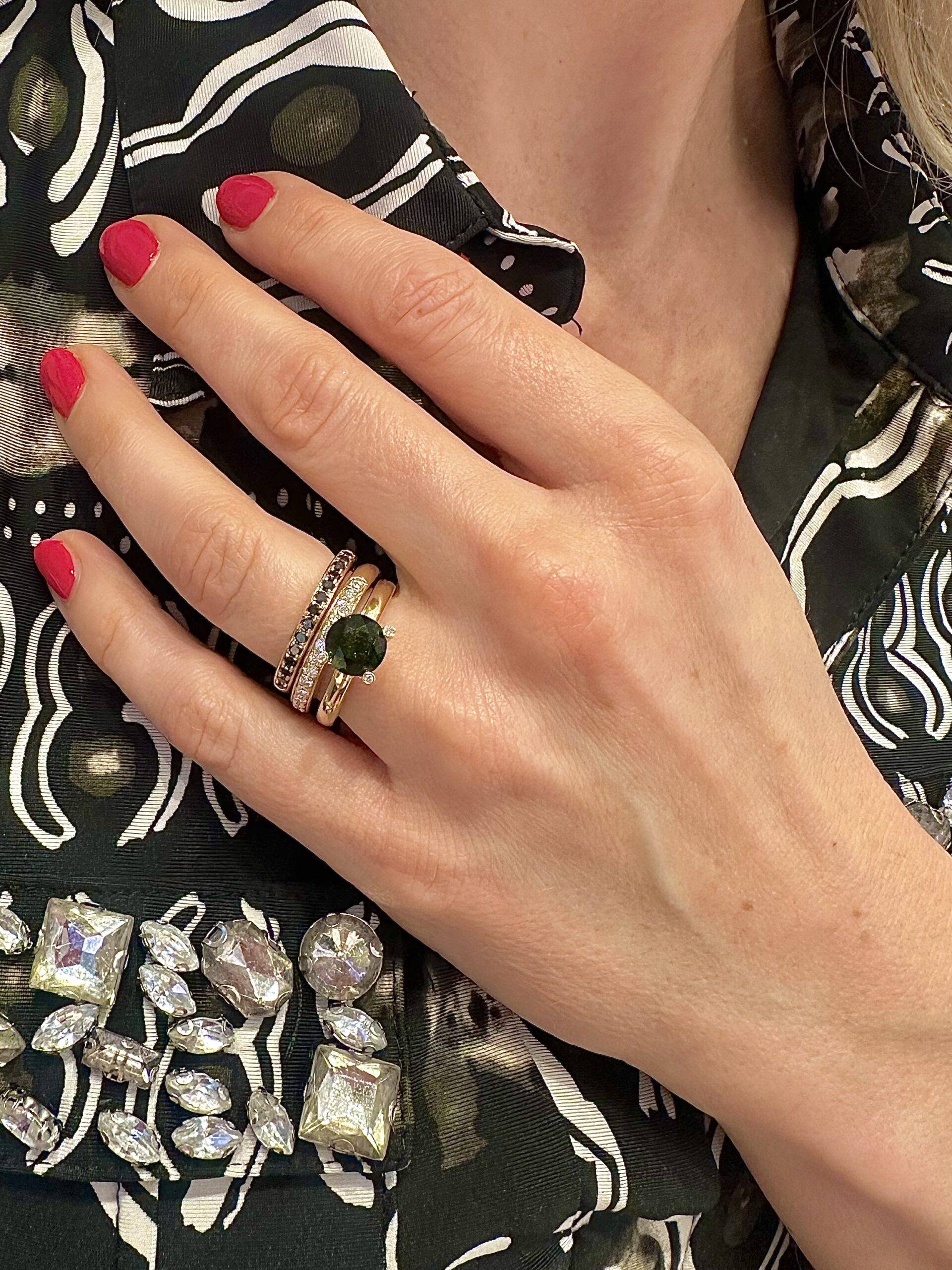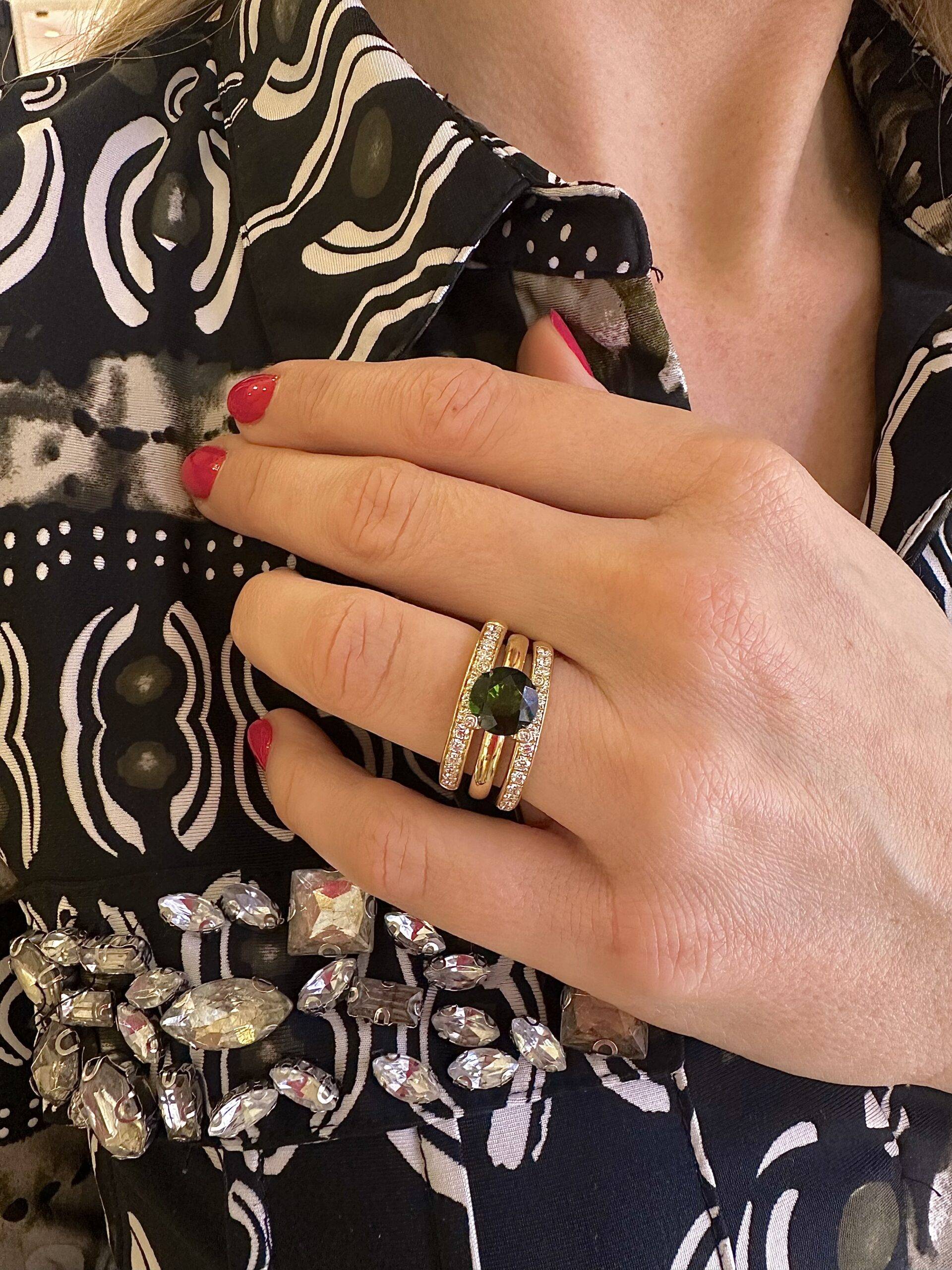 Massieve bolle band in 14K geelgoud, met een 4 poot chaton waarvan in elke poot een briljantje.