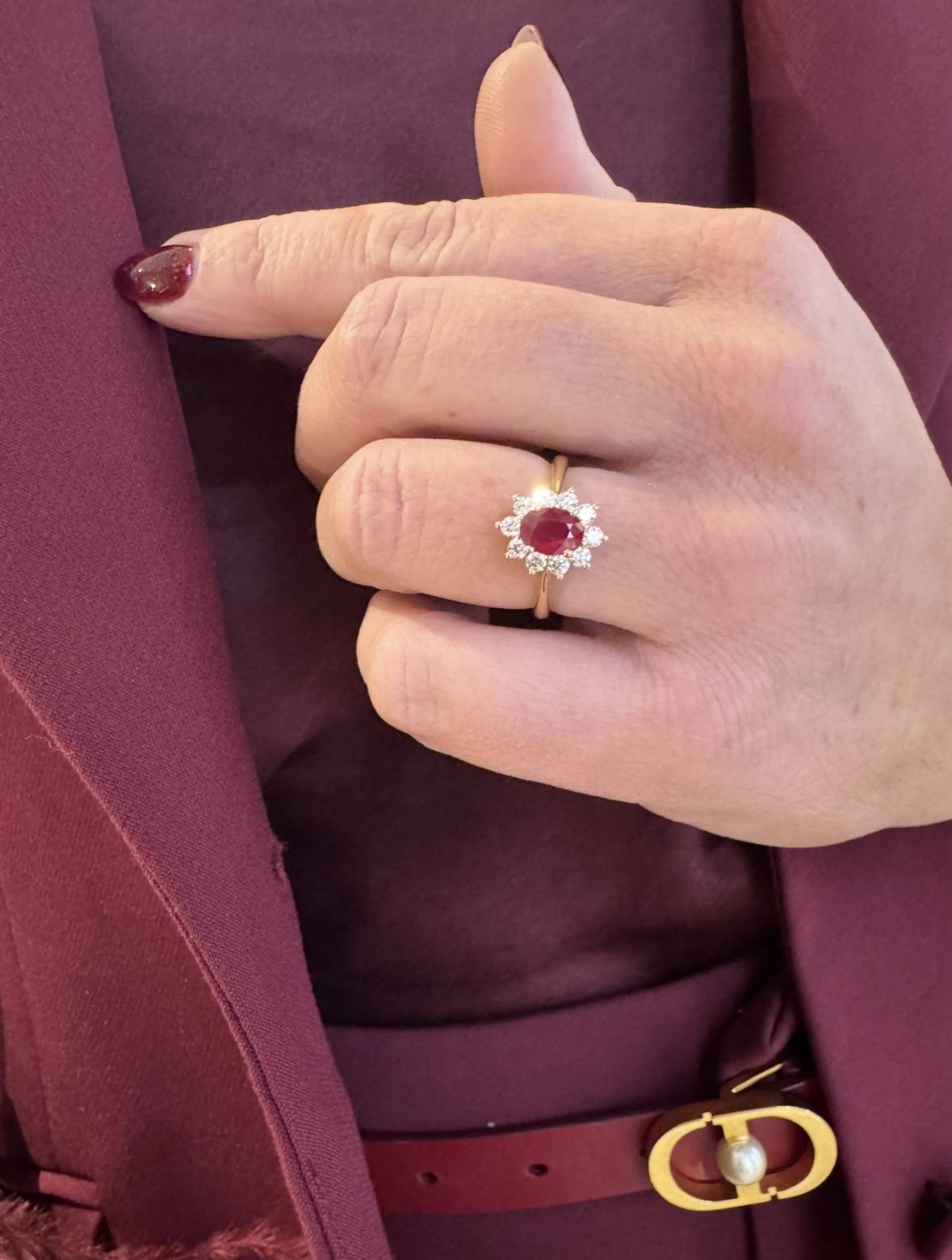 Met een ovale Robijn in 0,90crt en daaromheen briljanten waarvan totaal 0,50crt Si Wesselton.