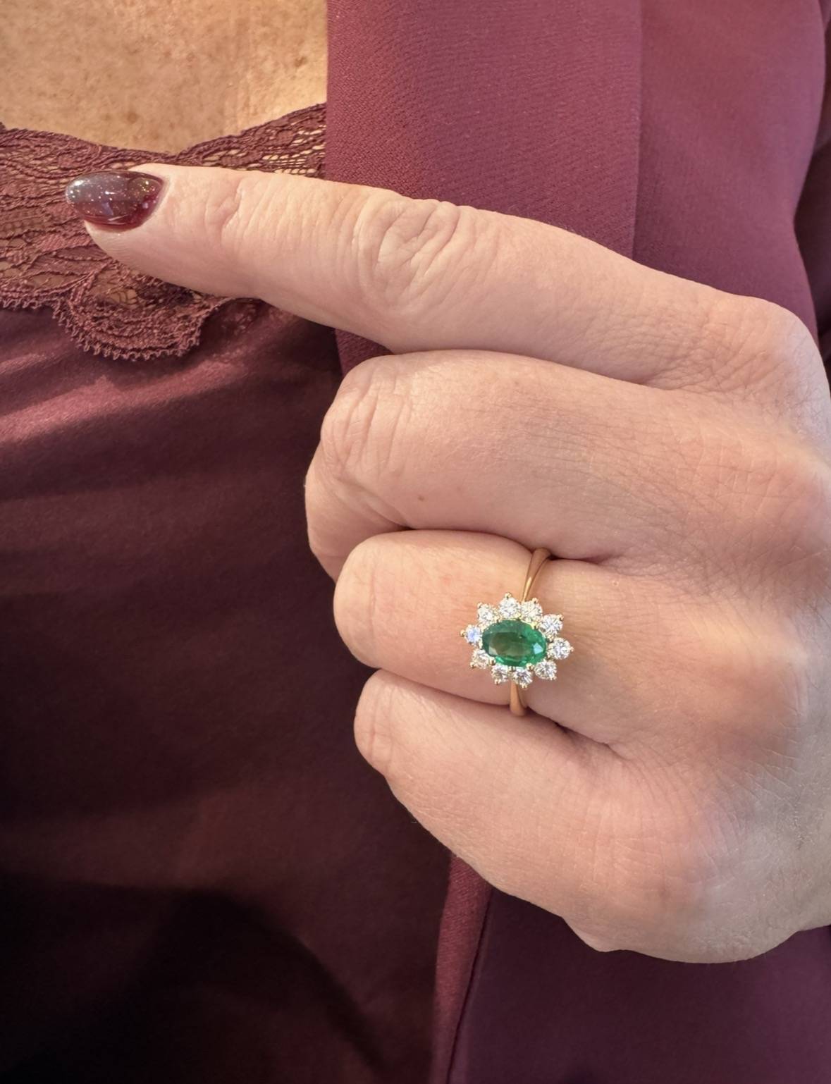 Met een ovale Smaragd in 0,61crt en daaromheen briljanten waarvan totaal 0,50crt Si Wesselton.