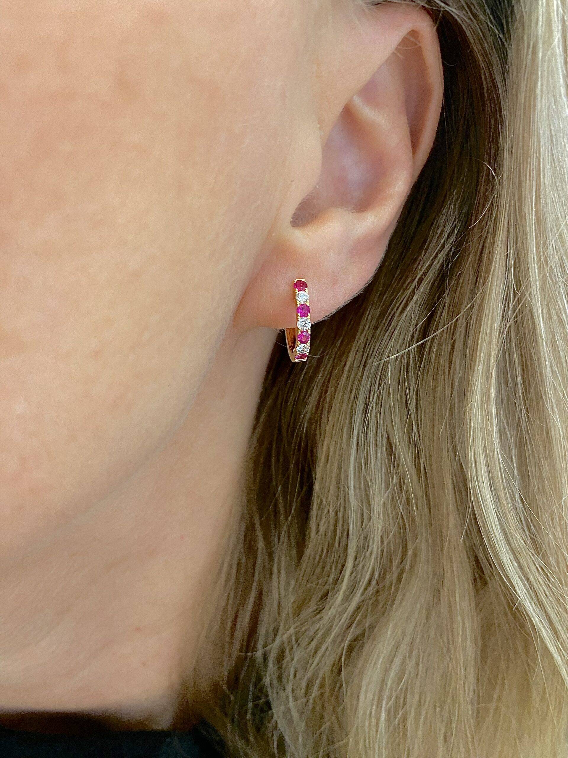 18k gouden klapcreoolen met diamant 0.21crt si wesselton en robijn.