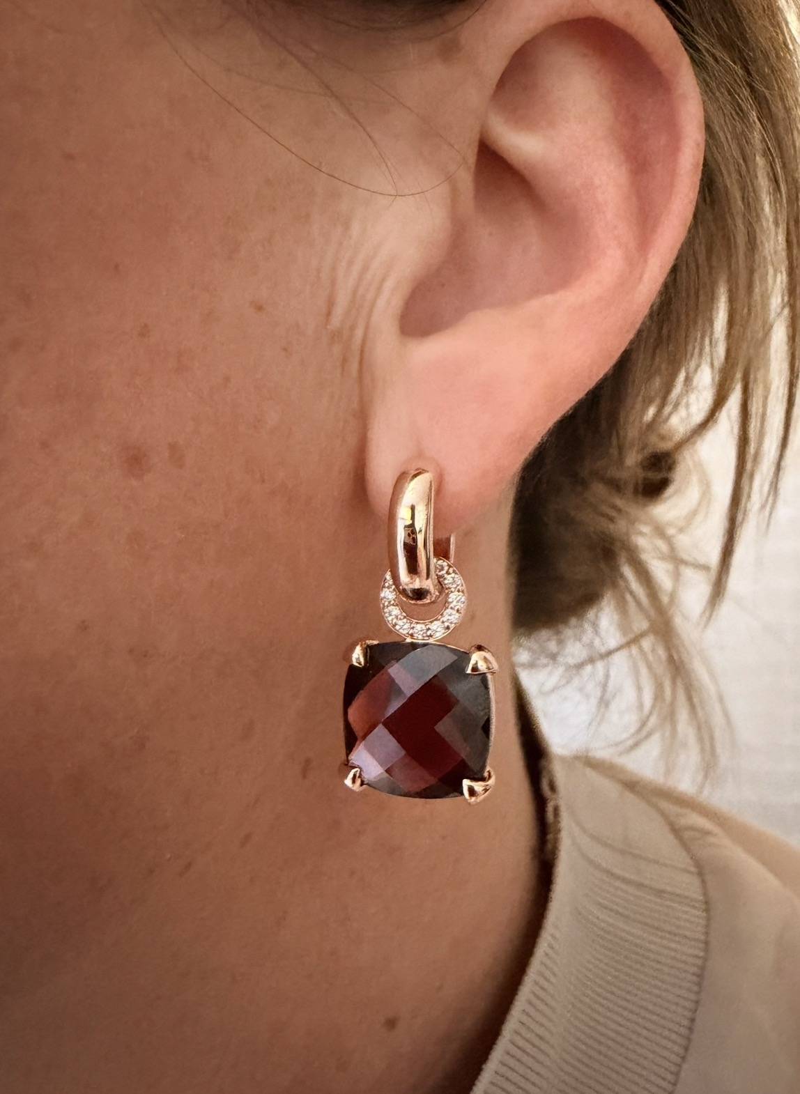Bijzondere klasse! Deze rosé gouden oorbellen met Red Garnet en diamant. Wist je dat wij veel verschillende varianten hebben op deze oorhangers? Mix en match met andere kleuren !