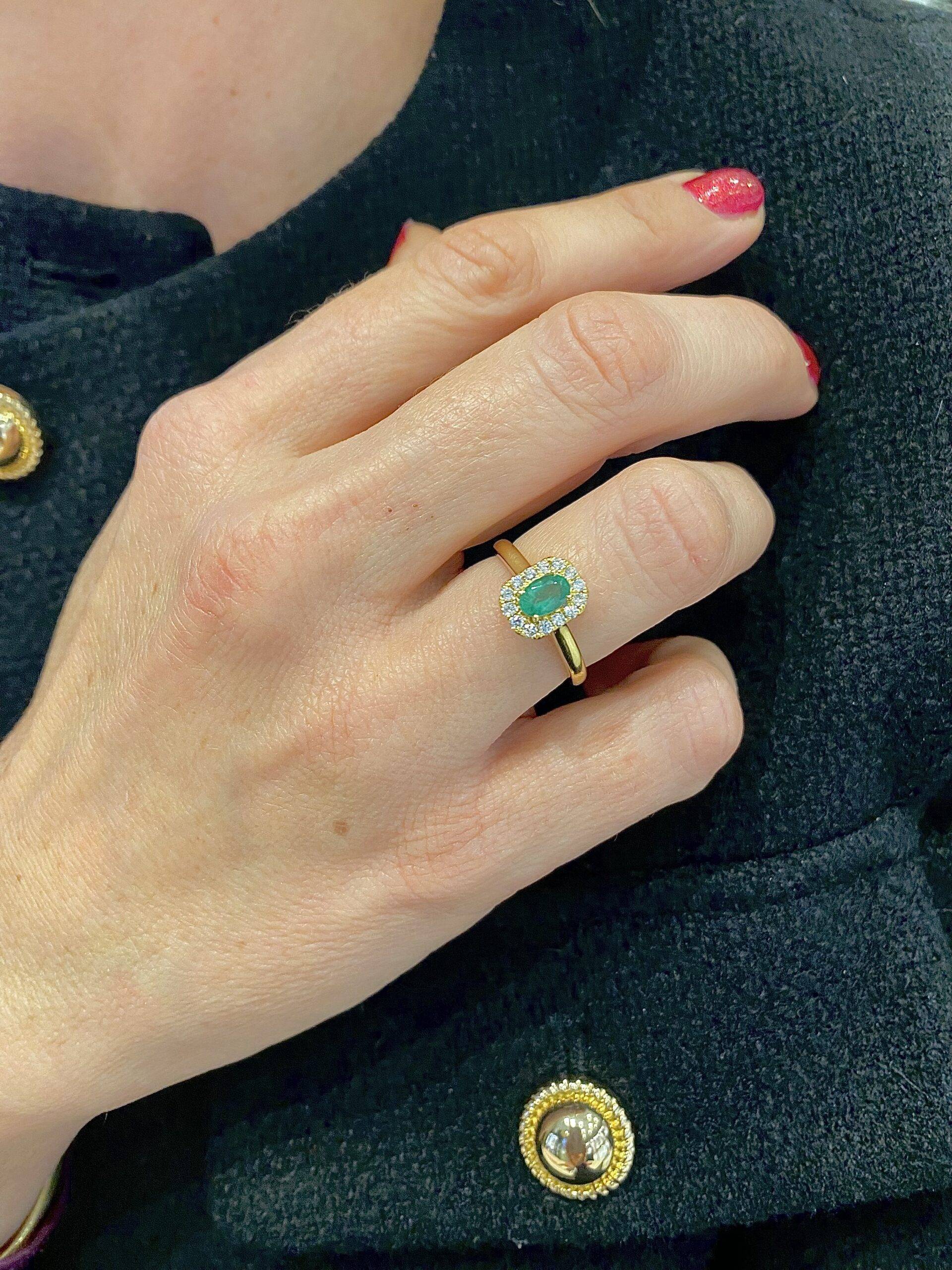 De ovale smaragd in omringt met briljanten, waarvan in totaal 0.21crt SI Wesselton
